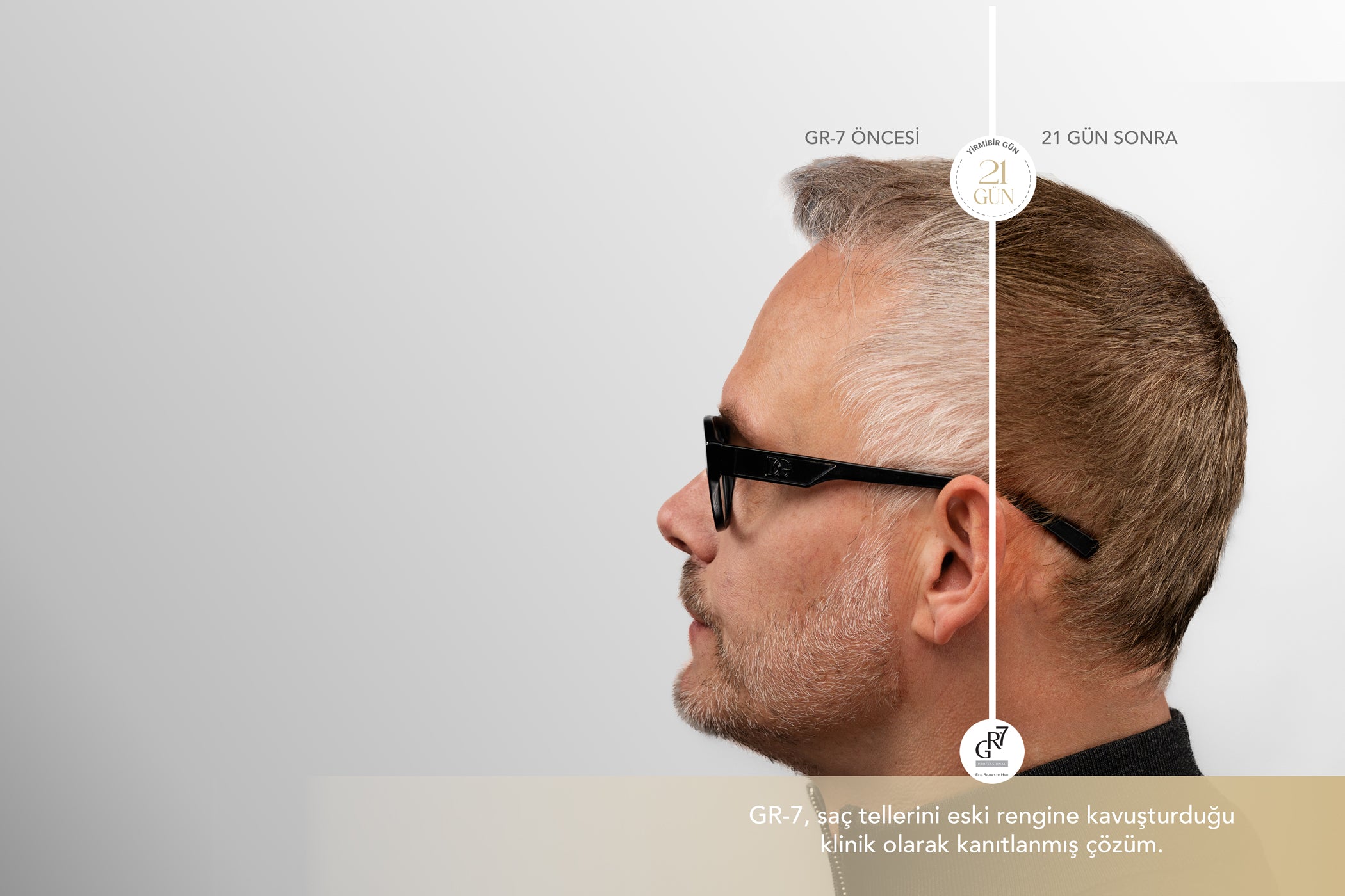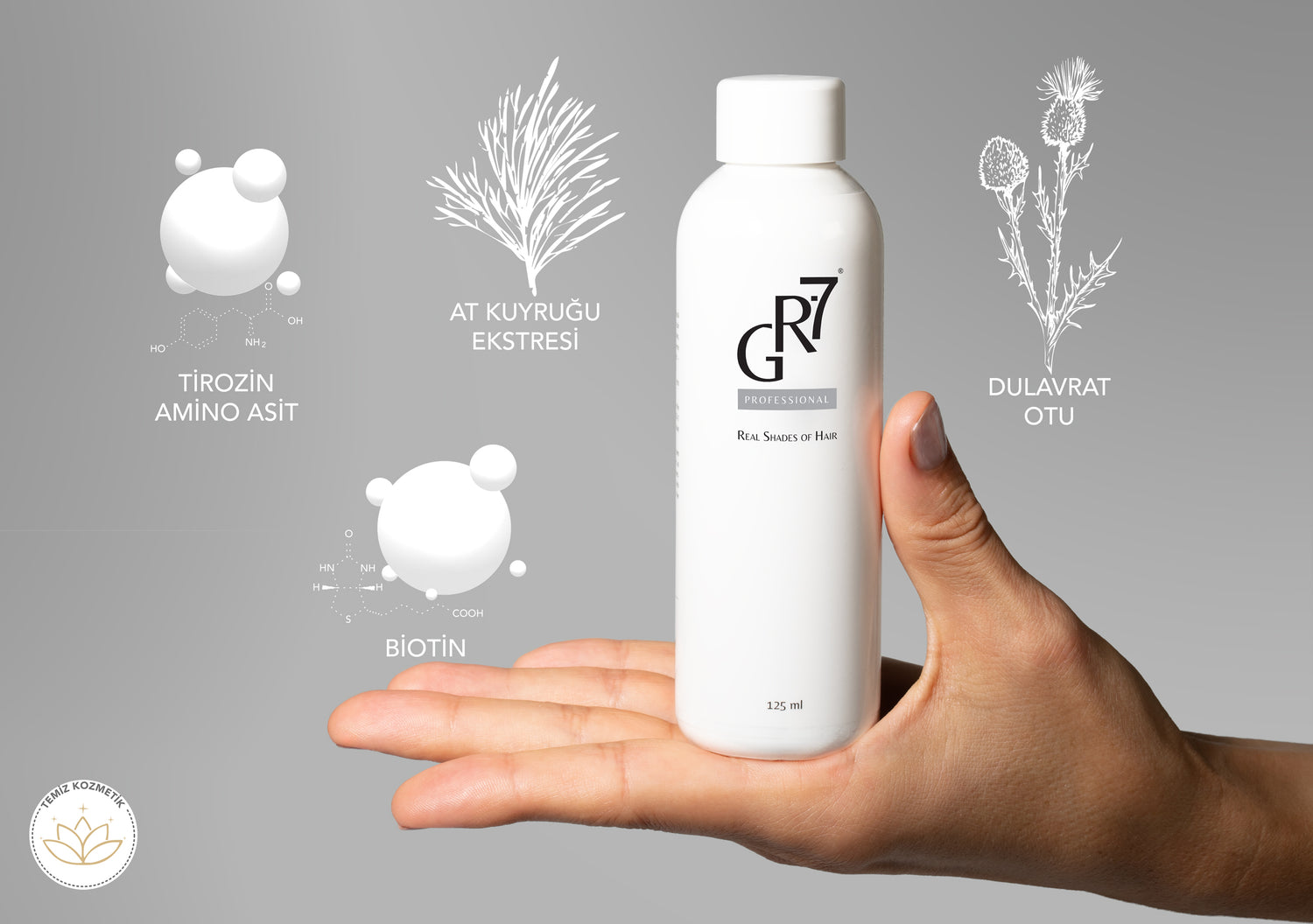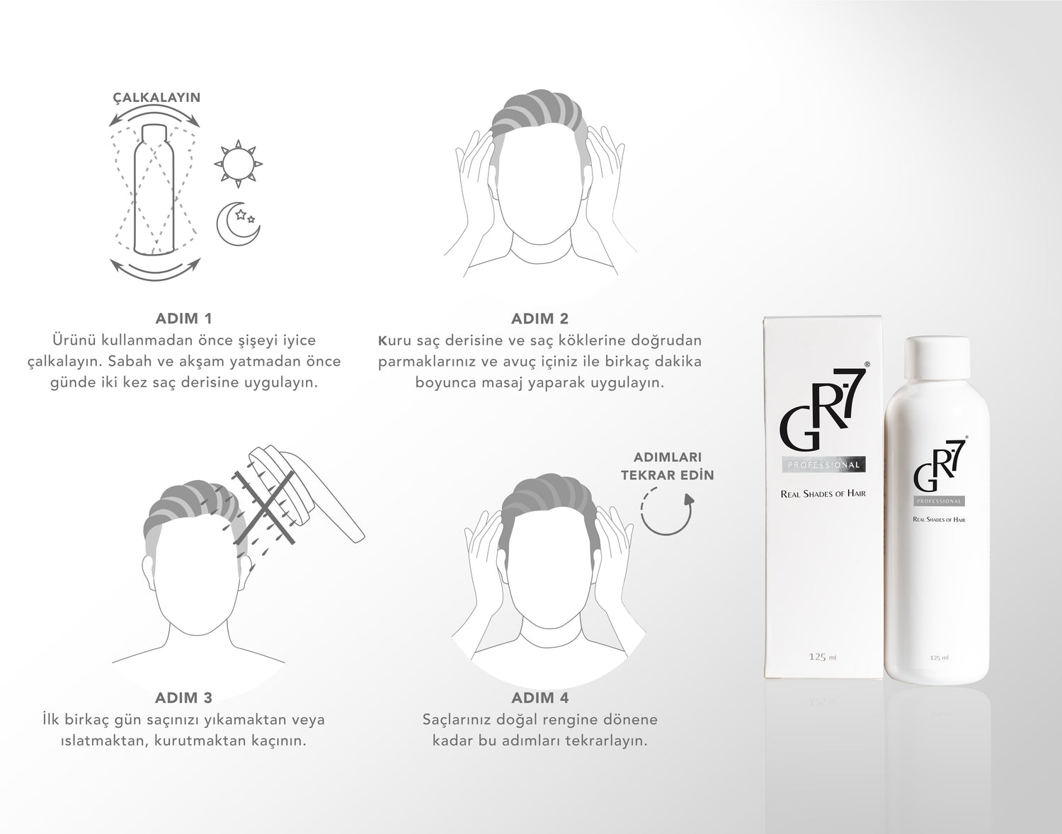 GR-7 Anti-Grey Saç Losyonu, saç boyası ya da beyaz kapatıcı değildir, sert kimyasallar içermez, her saç tipine ve rengine uygun formülüyle, saçları adım adım orijinal rengine kavuşturur, yıkanmayla akmaz ve kalıcı bir etki sağlar.